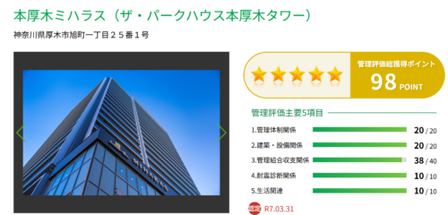 【制度認定】管理適正評価制度において、98点(五つ星)を取得しました ザ・パークハウス本厚木タワー